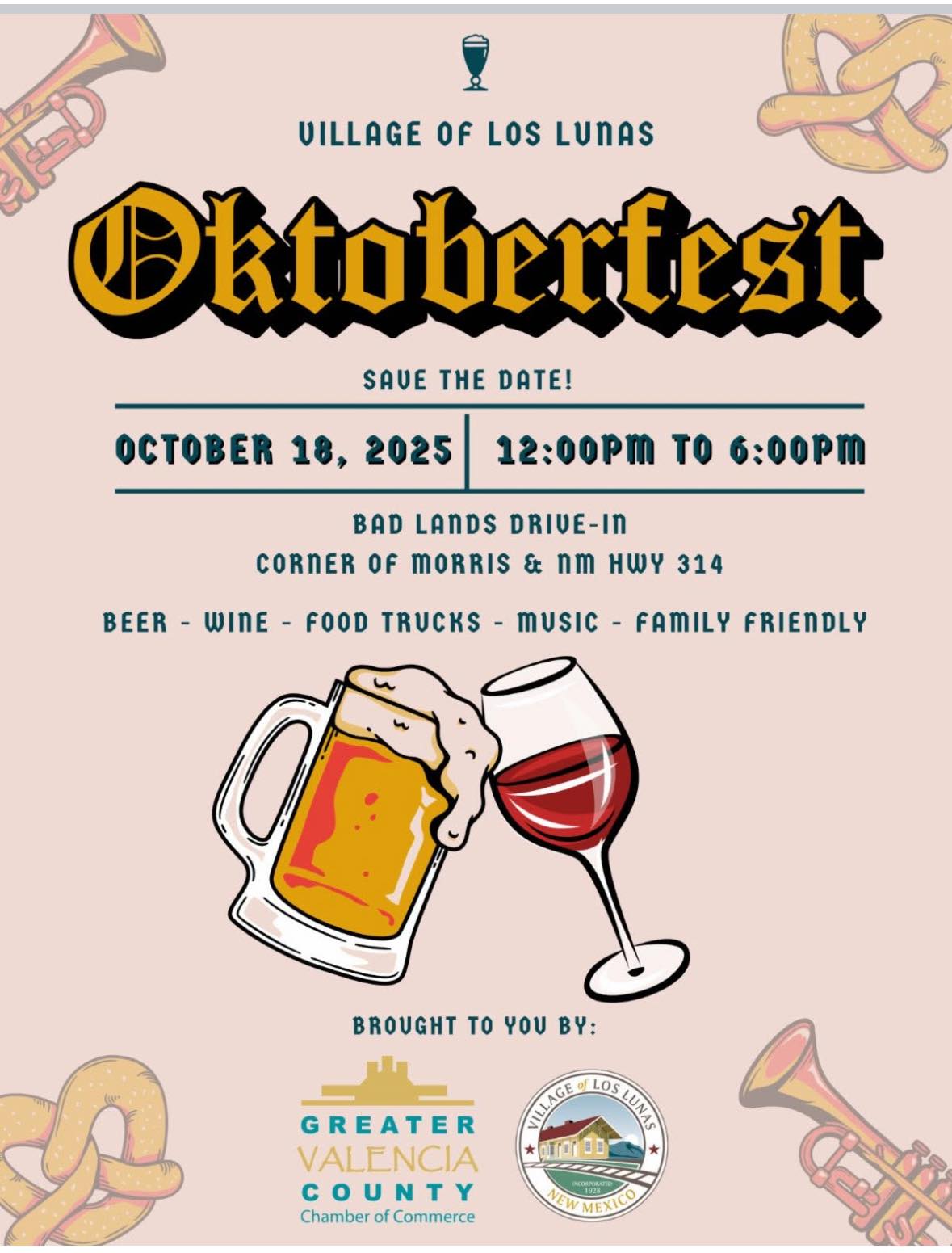 The Valencia County Chamber of Commerce will host an Oktoberfest celebration in Los Lunas on Saturday, October 18, from noon to 6 p.m. at the Badlands Drive-In. Kids can enjoy arts and crafts, while adults can sample beer and wine tastings. Food trucks, artisan vendors, and live music—including the Daniel Solis Band—will keep the fun going. The event will conclude with a spectacular balloon glow in the evening. Don’t miss it!